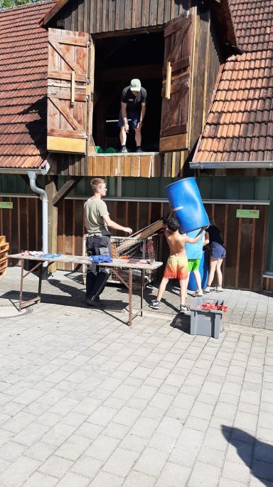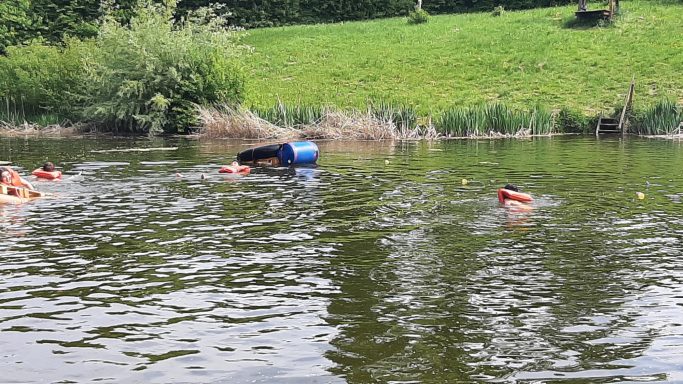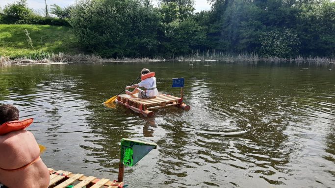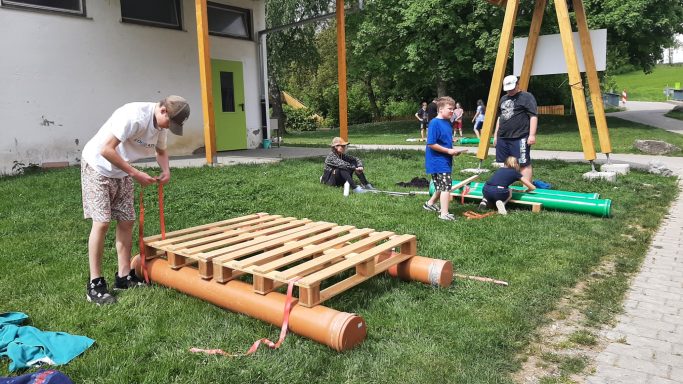 Gestärkt starteten wir mit dem erlebnispädagogischen Projekt „Floßbau“. Die Schülerinnen und Schüler bekamen die Aufgabe, aus vorgegebenem Material ein Floß zu bauen. Trotz anfänglicher Differenzen innerhalb einzelner Gruppen konnte alle ihr Floß im See testen und fahren. Alle Flöße schwammen, so dass am Ende ein Wettrennen möglich war.