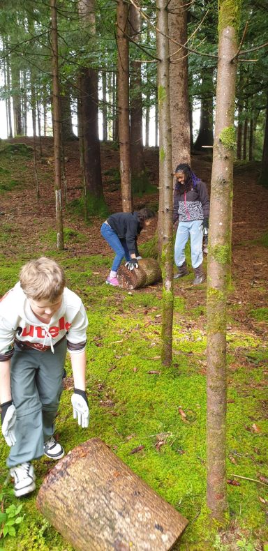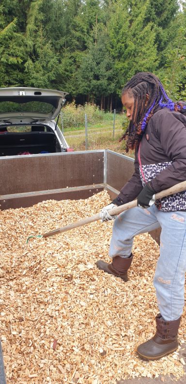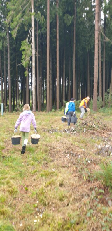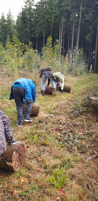 Gemeinsam fuhren wir an unseren Waldplatz bei Gebrazhofen. Dort angekommen, halfen alle mit, die Hackschnitzel mit Eimern abzuladen und zu verteilen, um unseren neuen Platz für die „Waldschule im Freien“ zu schaffen. Später rollten die Schülerinnen und Schüler noch Baumstämme als Sitzgelegenheit an und stellten sie auf. Am Ende des Nachmittags waren sich alle einig: Das war ganz schön anstrengend und gleichzeitig eine tolle gemeinsame Aktion.