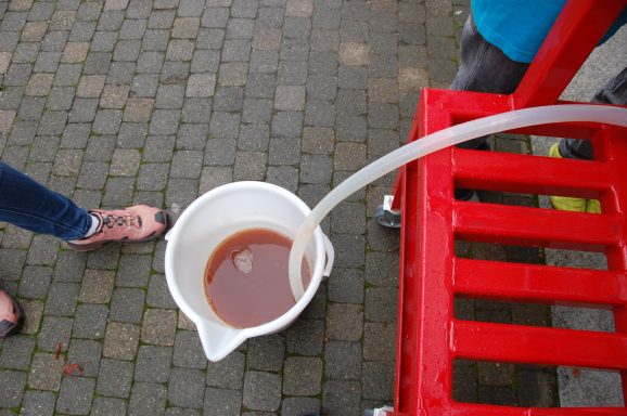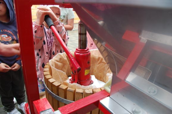 Vom Apfel zum ApfelsaftIm Rahmen des Natur- und Waldprojektes welches dieses Schuljahr schwerpunktmäßig in der Klassenstufe H1 stattfindet machten sich die Schüler/innen der H1 mit guter Laune und einem Eimer zunächst auf den Weg um Äpfel zu sammeln. Schon während des Sammelns wurde in den einen oder anderen Apfel direkt gebissen: „Hmm ist der lecker! Direkt vom Baum schmeckt’s am besten!“ Die Eimer waren schnell gefüllt. Nachdem die Äpfel eine Woche lagerten war es am Donnerstag den 26.09.204 soweit: Frau Grüner hatte eine Apfelpresse organisiert und lud diese direkt vor der Schule aus. Spätestens jetzt war klar: Heute wird aus unseren Äpfeln Apfelsaft! Alle Schüler/innen der G1 H1 und H2 durften sich an dieser Apfelsaftaktion beteiligen. Zunächst wurden die Äpfel gewaschen danach klein geschnitten und erst dann wurden sie in die Apfelpresse gefüllt. Die Schüler/innen waren alle sehr gespannt und wollten am liebsten alle auf einmal die Handkurbel zuerst betätigen um die Äpfel zu zerkleinern. Später pressten die Schüler/innen mit Hilfe einer Hydraulikpresse die zerkleinerten Äpfel von Hand solange bis der frisch gepresste Apfelsaft aus dem Schlauch lief. Sie staunten nicht schlecht und waren sich einig: Unser Apfelsaft schmeckt frisch fruchtig und lecker!