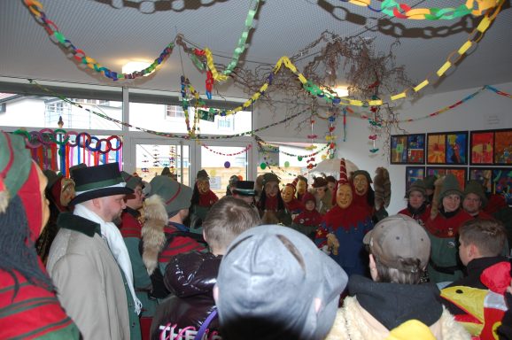 Als dann noch der Musikverein mit den Hudelmale, den Reitenderle und den Zunfträten reingehudelt kamen, wurde gesungen und geschunkelt. Alle Schülerinnen und Schüler bekamen eine Brezel, während die Lehrerinnen von den Narren gefesselt wurden. Damit waren die Schüler befreit und durften fröhlich in die wohlverdienten Ferien.